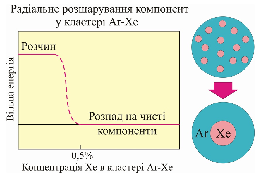 ● Виявлено фазове розшарування на чисті компоненти в кластерах Ar-Xe (у масивних
