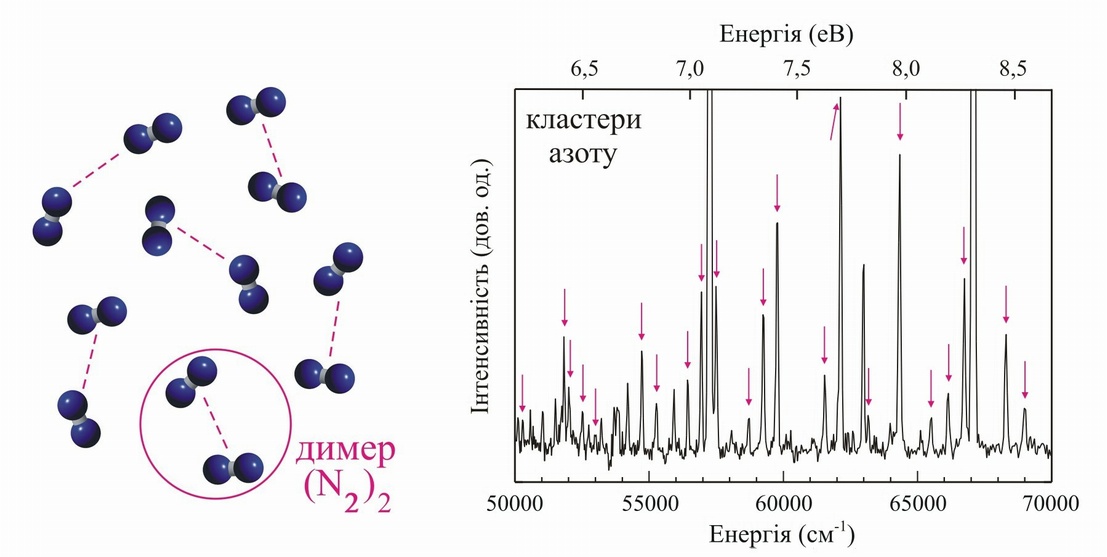 Виявлення молекулярних димерів (N2)2 у кластерах N2 та Ar-N2 [Phys. Rev. A 84, No. 2, 023201 (2011)].