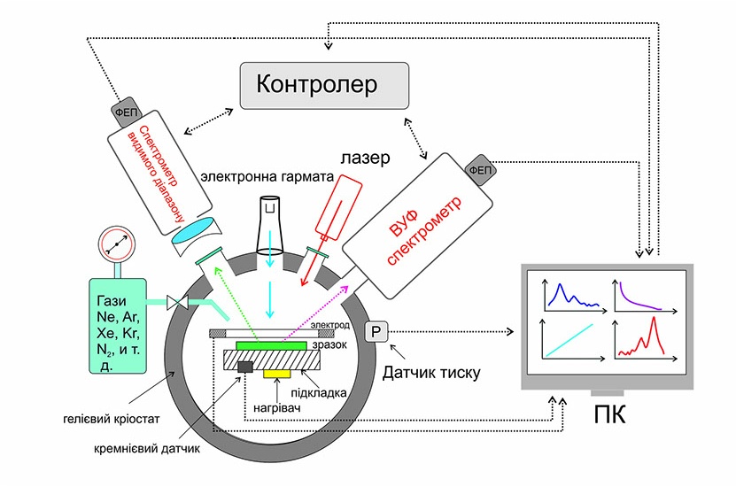 Багатофункціональна установка для оптичної і струмової спектроскопії кріоконденсатів, наноструктурованих і масивних зразків.